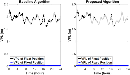 Fig. 2. VPL simulation results of float and fixed position solutions under nominal conditions. The left panel shows the results using the baseline algorithm, while the right panel presents those using the proposed Z-matrix candidate generation method. Improvements in P(CF) lead to higher availability of fixed solutions.