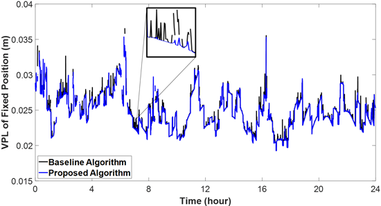 Fig. 3은 두 알고리즘을 적용하여 산출한 고정 위치해 VPL 결과를 비교한 것이다. 본 그래프는 Eq. (8)에 따라 산출된 고정 위치해 VPL의 시간 변화 양상을 나타내며, 해당 값은 고정 위치해의 수직 방향 표준편차와 P(CF)에 의해 결정된다. 시뮬레이션 결과, 기존 Z-행렬 탐색 알고리즘을 적용한 경우 일부 구간에서 고정 위치해 VPL 값에 비정상적으로 큰 분산이 나타나는 등, 국부적인 불안정성이 관측되었다. 반면, 제안한 후보군 생성 기법을 적용한 경우 VPL 값이 안정적으로 유지되는 양상을 보였다. 두 기법 모두 동일한 GNSS 측정치를 기반으로 하므로, 고정 위치해의 수직 방향 표준편차나 미지정수 실수해의 공분산 행렬에는 차이가 없다. 따라서 관측된 VPL 변화는 Z-행렬의 성능 차이에 기인한다고 해석할 수 있다. 이와 같은 결과는 기존 기법의 경우 탐색 종료 조건에 의해 비최적 Z-행렬이 산출되는 경우가 많아 VPL이 불안정하게 변동하는 반면, 제안 기법은 후보군 기반 탐색을 통해 보다 최적성이 높은 Z-행렬을 선택함으로써 VPL의 안정성과 신뢰도를 향상시킬 수 있음을 시사한다.