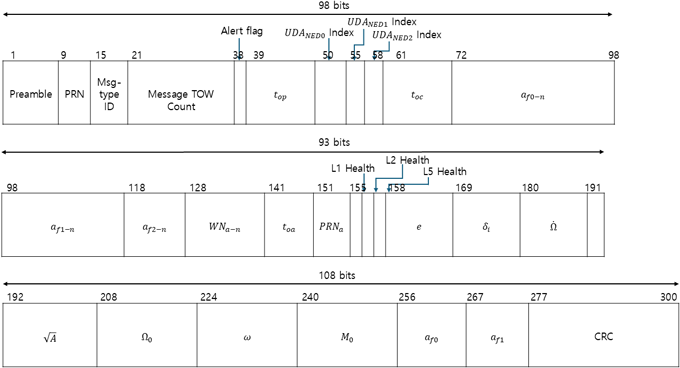Midi 알마낙의 경우 구체적인 항법메시지 추출과정은 다음과 같다. Midi 알마낙은 메시지 타입 37에 포함되어 있으며 구조는 Fig. 1과 같다. 16진수로 구성된 NavBits를 2진수로 변환하여 메시지를 구성하는 각 요소당 할당된 데이터로 2진수 데이터를 구분하면 QZSS CNAV L2C 원시 데이터 속 Midi 알마낙을 해석할 수 있다. 해석된 데이터는 실제 물리량이 아니기 때문에 한 번의 변환 과정이 더 필요하다. Least Significant Bit (LSB)를 각 요소의 값에 곱하여 실제 물리량을 알 수 있으며 Midi 알마낙의 각 요소당 할당된 데이터 및 LSB는 Table 7에 정리하였다.