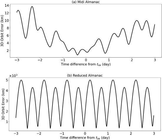 QZSS는 현대화된 항법메시지인 Civil Navigation (CNAV)을 통해 두 종류의 알마낙을 제공한다 (Kim et al. 2024). 하나는 기존 QZSS Legacy Navigation (LNAV) 형식의 알마낙과 동일한 11개의 궤도 요소로 구성된 Midi 알마낙이며, 다른 하나는 5개의 궤도 요소로 구성된 Reduced 알마낙이다 (IS-QZSS-PNT-006 2024). 이처럼 Reduced 알마낙은 위성당 제공하는 궤도 정보량이 상대적으로 매우 적기 때문에 전체 위성의 위치를 Midi 알마낙보다 빠르게 전송할 수 있는 이점이 있지만, 제공 정보가 축소된 만큼 위성 위치 추정의 정확도는 상대적으로 낮아질 수 있다 (Lee et al. 2025). 특히, CNAV와 LNAV의 알마낙은 중궤도(Medium Earth Orbit, MEO)를 사용하는 GPS를 대상으로 개발되어 고도 36,000 km의 정지궤도(Geostationary Earth Orbit, GEO)와 지구동기경사궤도(Inclined Geosynchronized Orbit, IGSO)에 최적화된 형식이 아니기 때문에 GPS와는 다른 수준의 궤도 정확도를 가진다 (Xiaogang & Mingquan 2017).