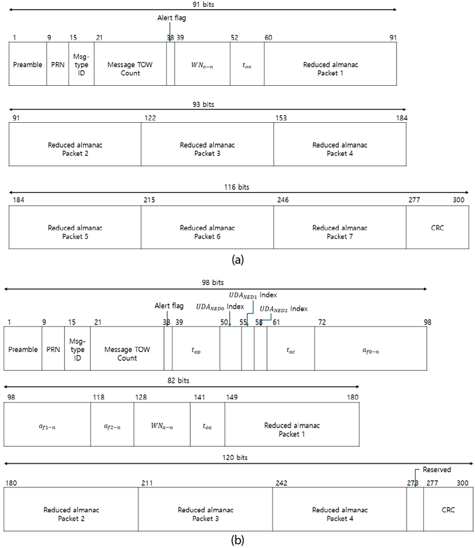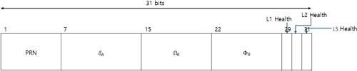 Reduced 알마낙은 메시지 타입 12와 31에 포함되며 메시지 구조는 Fig. 2와 같다. Midi 알마낙과 달리 Almanac reference week ($WN_{a-n}$), Almanac reference time of week ($t_{oa}$)을 제외한 궤도 요소와 위성 Pseudo Random Noise (PRN) Code 정보가 Reduced 알마낙 패킷에 있으며 메시지마다 패킷에 담긴 정보의 차이가 있다. 메시지 타입 12는 총 7개의 Reduced 알마낙 패킷을 가지며, 보통 1번과 3번 패킷에 PRN 196와 PRN 200 위성의 Reduced 알마낙이 포함된다. 메시지 타입 31은 4개의 패킷을 가지며 2, 3, 4번 패킷에 각각 PRN 194, PRN 195, PRN 199 위성의 데이터를 포함한다. 모든 패킷은 Fig. 3과 같이 동일한 구조를 갖는다. Midi 알마낙과 마찬가지로 처음 신호에서 얻은 값은 실제 물리량이 아니기 때문에 각 요소에 적절한 LSB를 곱하여 실제 물리량을 얻으며 Reduced 알마낙의 각 요소당 LSB는 Table 8에 정리하였다.