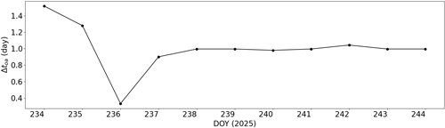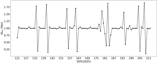 Fig. 5에서 수행한 단기 분석(8월 21일부터 9월 1일까지)과 별도로, Midi 알마낙 기준시각의 장기적인 갱신 패턴 확인하기위해 Fig. 5의 시점을 제외한 2025년 5월 4일부터 8월 3일까지 약 3개월간 QZSS 아카이브의 데이터를 분석하여 Fig. 6에 나타냈다. 분석기간이 3개월로 늘어남에 따라, Fig. 6에서는 Fig. 5와 달리 더 큰 변동폭이 확인되었다. Fig. 6에서는 QZSS Midi 알마낙의 생성 주기가 QZSS ICD (IS-QZSS-PNT-006 2024)에 정의된 1일 주기를 안정적으로 유지하지 않았다. 1일 주기를 지키는 DOY도 있었지만, 몇몇 DOY에서 0.25~1.75일의 불규칙한 갱신 주기가 다수 관찰되었다. 이는 현재 QZSS 위성군이 완전하게 구축되지 않은 과도기적 운용 상태에서 기인한 것으로 예상된다.