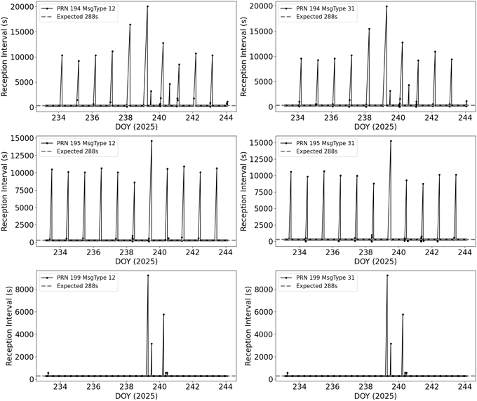 QZSS ICD (IS-QZSS-PNT-006 2024)에 따르면, 메시지 타입 12와 메시지 타입31(Reduced 알마낙을 포함한 메시지 타입들)을 최대 1200초의 전송 간격을 갖는다. 이번 절에서는 이 규격이 실제 운용 환경에서 일관되게 충족되는지 검증하였다.