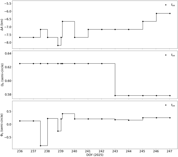 Fig. 8은 실험기간(2025년 8월 21일 ~ 9월 1일)동안 수집된 15개의 유효 기준시각(붉은 점)에 해당하는 각 궤도 요소의 값(y축)을 DOY(x축)에 따라 나타냈다. 이 그림은 각 궤도 요소의 동적 특성을 보여준다. $\Omega_0$은 가장 안정적인 변화를 가지며 분석 기간 동안 단 한 차례의 변화만 관측되었다. 값은 약 0.62 semi-circle 수준을 일정하게 유지하다가 약 0.58 semi-circle로 하강하여, 0.04 semi-circle 정도의 변동폭을 갖는다. $\Delta A$는 분석 기간 동안 다수의 변화가 관측됐으며 값의 범위는 최소 약 -8 km에서 최대 약 -6.3 km에 걸쳐, 전체 변동 폭이 약 1.8 km에 달한다. 또한, $\Phi_0$도 다수의 변화가 있었으며 값의 범위는 최소 약 -0.8 semi-circle에서 최대 약 0.2 semi-circle까지, 약 1 semi-circle의 변동 폭을 보인다. Reduced 알마낙의 궤도 요소에서 $\Omega_0$은 값이 잘 변하지 않는 정적인 궤도 요소, $\Delta A$, $\Omega_0$은 빈번하게 갱신되는 동적인 궤도요소임을 알 수있다.