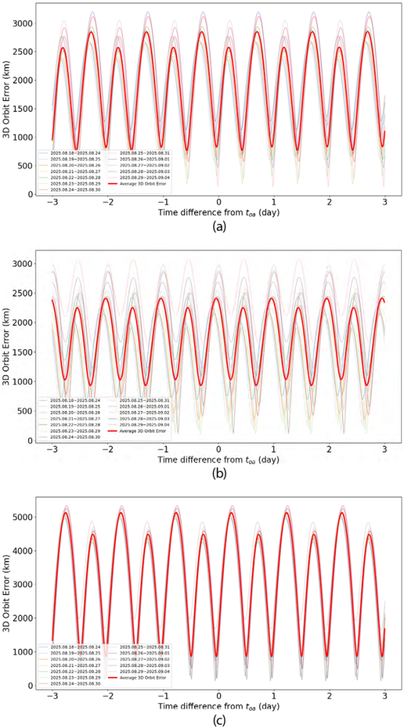 둘째, Reduced 알마낙은 구조적으로 수천 km의 위치 오차를 내포한다. 본 연구의 핵심 목표였던 정확도 분석 결과 Midi 알마낙은 정밀궤도력 대비 ≤10 km (3D-1σ)의 오차를 보여 성능 기준을 충족했다. 반면, Reduced 알마낙은 정밀궤도력 대비 수천 km에 달하는 매우 큰 오차를 나타냈다.