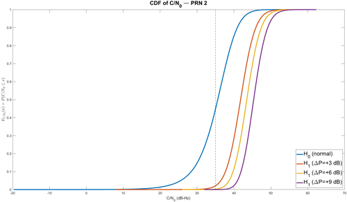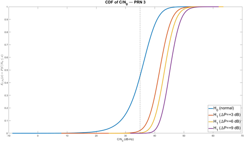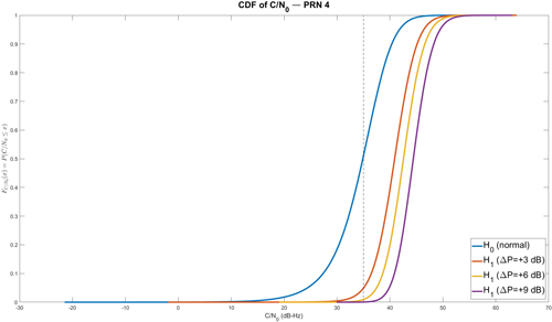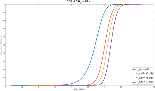 정상 수신 상태에서의 C/N0 거동은 비교적 안정적이다. 추적 중인 PRN이 Line-Of-Sight (LOS) 상태이면 C/N0를 35 [dB-Hz] 부근으로 가정할 수 있으므로 (Wieser 2006), 이 연구에서는 평균 35 dB-Hz 부근을 중심으로 작은 섭동을 가진다고 가정하였고, 이를 H0에 반영하였다.