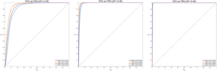 시뮬레이션 결과 모든 PRN에서 Area Under the ROC Curve (AUC) 값이 0.9 이상을 보여 H0 상황과 H1 간의 통계량 분포가 완전히 분리되어, 원활한 탐지를 할 수 있음을 확인하였다.