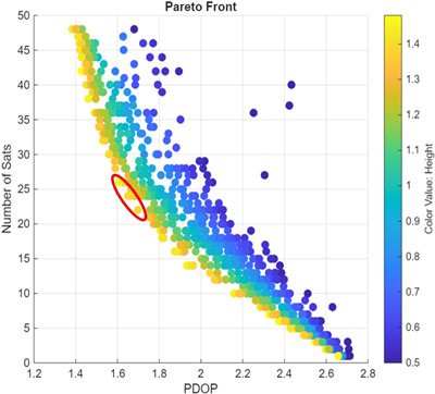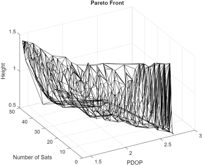 이 목적함수들을 최적화하기 위해서는 저궤도 위성들이 가능한 한 국내 상공에 넓게 분포하여 사용자에게 좋은 기하학적 배치를 제공해야 한다. 이는 위성군의 궤도 경사각, 고도, 위성 수 및 위상 배치에 직접적으로 영향을 받는다. 예를 들어, 특정 경사각을 가진 위성은 다른 경사각의 위성보다 국내 지역을 더 자주, 더 높은 고도각으로 통과할 수 있어 DOP 성능에 유리할 수 있다. NSGA-II 알고리즘을 이용한 최적화 과정은 이러한 복잡한 관계를 고려하여, DOP를 최소화하며 동시에 위성의 총 수를 최소화할 수 있는 궤도 파라미터의 조합들을 효율적으로 탐색하여 서로 상충하는 3개의 목적함수에 대한 파레토 최적해들을 찾아서 3차원 파레토 전선를 만들어낸다.
