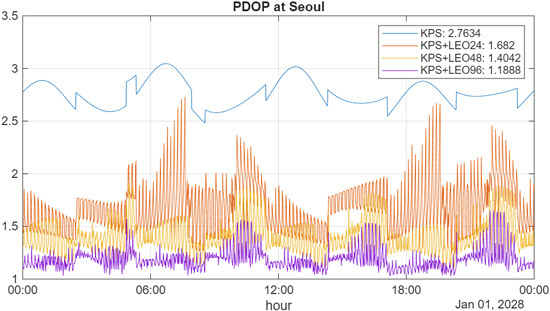 DOP는 위성 항법에서 수신기 위치와 가시 위성들의 기하학적 배치 구조가 위치 정확도에 미치는 영향을 나타내는 지수이다. 위성들이 하늘에 넓게 퍼져 있을수록 기하학적 구조가 강하며 DOP 값은 낮아지고, 반대로 위성들이 서로 가깝게 모여 있으면 기하학적 구조가 약해져 DOP 값은 높아진다. KPS 시스템에 저궤도 위성군을 추가하면 가시 위성의 수가 절대적으로 증가하고 다양한 값을 갖는 고도와 방위각의 위성들이 추가되므로, 전반적인 기하학적 구조가 강화되어 DOP 값이 감소하는 효과를 기대할 수 있다. 이는 곧 사용자 위치 정확도의 향상으로 이어진다.