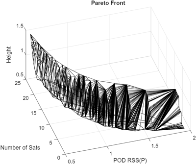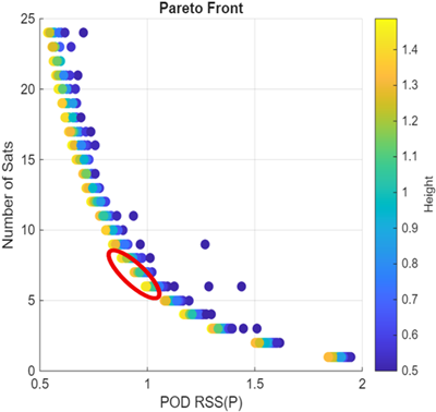 Fig. 7의 2차원 파레토 전선을 이용해서 위성 궤도 설계의 자유도를 얻을 수 있다. 예를 들어 RSS 값을 1로 맞추는 설계를 하고자 할 경우, Fig. 7에서 RSS = 1에 해당하는 수직선과 파레토 전선이 교차점에서 몇 가지 선택을 할 수 있다. 위성의 수가 6인 경우는 고도가 1,400 km, 7인 경우는 700 km, 8인 경우는 500 km 정도에 해당하는 궤도 후보 중에서 설계 목적에 적합한 궤도를 선택할 수 있다. 위성 수를 먼저 제한하는 경우에는 예를 위성 수를 6개로 제한한 경우에는 Fig. 7에서 위성의 수가 6인 점들의 집합인 수평선 중에서 선택할 수 있다. 이 경우에는 선택하는 고도에 따라 RSS 값이 1에서 1.44까지의 크기를 갖는 궤도를 선택할 수 있다.