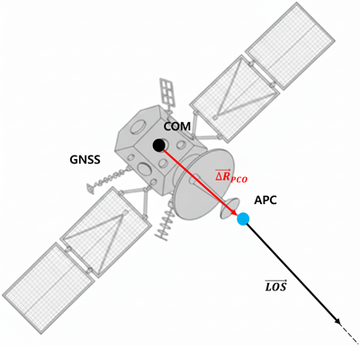 여기서 $R_{APC}^j$는 위성 $j$의 APC 기준 ECEF 위치 벡터, $R_{COM}^j$는 COM 기준 ECEF 위치 벡터, $T_{ECEF}^{body}$ 는 위성 본체 좌표계에서 ECEF 좌표계로의 변환 행렬, $\Delta R_{PCO}^j$는 위성 본체 좌표계에서 정의된 PCO 벡터를 나타낸다.