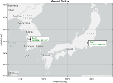 보정정보 성능 분석을 위한 GNSS 관측 데이터는 Crustal Dynamics Data Information System (CDDIS)를 통해 IGS 기준국 관측 데이터를 취득하였다. KASS 보정정보 분석을 위해 한국 대전에 위치한 IGS 기준국 DAEJ의 관측 데이터를 사용하였으며, MSAS 보정정보 분석을 위해서는 일본 도쿄에 위치한 IGS 기준국 CHOF의 관측 데이터를 사용하였다. 두 기준국의 배치는 Fig. 2에 나타내었다.