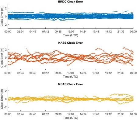 개별 오차 성분에서 KASS가 MSAS 대비 큰 값을 나타낸 것은 기준국 네트워크 분포의 차이로 분석된다. KASS는 MSAS 대비 제한적인 기준국 네트워크 분포를 가지고 있다. 위성에서 바라본 기준국의 기하학적 배치가 제한적일 경우 높은 DOP 값을 가지며, 궤도 오차와 시계 오차를 개별적으로 분리하여 추정하기 어렵다. 이로 인해 궤도 오차와 시계 오차는 역상관관계를 가지며 서로 결합된 형태로 나타나는 특성이 있다 (Jeong & Kim 2009). Table 2에서 KASS의 radial 궤도 오차 RMS가 1.1 m로 MSAS 0.4 m 대비 약 2.8배 큰 값을 갖는 것은 이러한 기준국 네트워크 분포 특성에 기인한 것으로 판단된다.