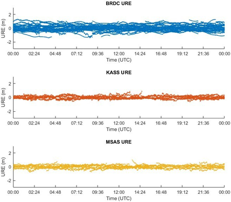 Fig. 5. Comparison of URE for BRDC, KASS, and MSAS (April 1, 2024).