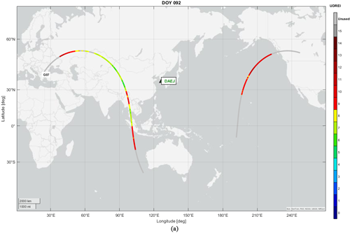 이러한 특정 위성의 URE 증가 원인을 파악하기 위해 Fig. 7에 해당 위성들의 지상궤적을 KASS 기준국(DAEJ) 및 MSAS 기준국(CHOF)과 함께 도시하고, 해당 시각의 UDREI 값을 나타내었다. 분석 결과, URE가 증가한 위성들은 각 SBAS 서비스 영역 통과 시 일부 구간만 관측되거나 지상궤적이 기준국 네트워크 바깥쪽을 지나 관측 기하학적 배치가 불량하였으며, 이러한 구간에서 UDREI가 9 이상의 높은 값을 나타내거나 미사용(unused)으로 처리된 것을 확인할 수 있다. 이는 관측 기하학적 배치가 불량하거나 관측 시간이 제한적인 경우 SBAS 시스템이 해당 위성에 높은 불확실성을 부여함을 의미하며, 이러한 경우 보정정보의 정확도가 저하되는 것으로 알려져 있다 (Jeong & Kim 2009). 높은 UDREI 값이 부여된 위성은 사용자 항법 해 계산 과정에서 낮은 가중치가 적용되므로, 이들 위성의 URE 증가가 실제 측위 정확도에 미치는 영향은 제한적일 것으로 판단된다.