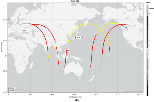 Fig. 7. Ground tracks of GPS satellites with elevated URE with UDREI on DOY 092: (a) as observed at DAEJ using KASS, and (b) as observed at CHOF using MSAS.