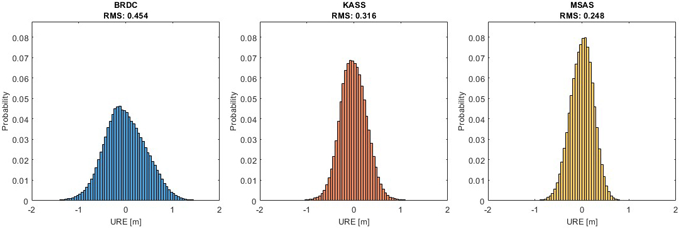 Fig. 8. Probability density functions of URE for BRDC, KASS, and MSAS.
